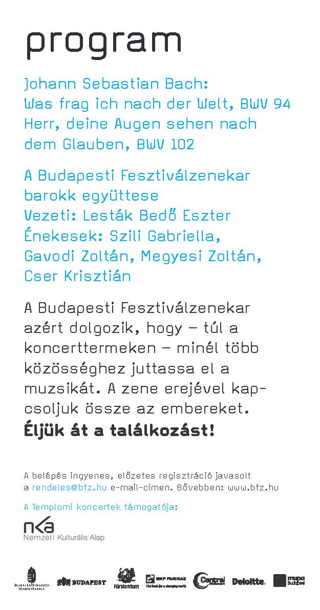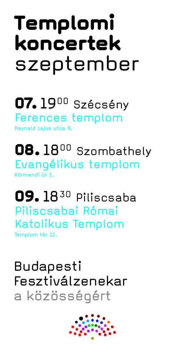 A Budapesti Fesztiválzenekar számára különösen fontos a közösségépítés. Az elmúlt több mint harminc évben a zenekar és közönsége nagy, zeneszerető családdá nőtte ki magát, amely folyamatosan bővül, és együtt éli át az évek során megszületett egység erejét. Közösségi Heteink egyik célja ennek a családnak a gyarapítása, a már meglévő közösségek összekovácsolása és megerősítése, illetve újak létrehozása a zene erejével. Rengeteg olyan muzsikára nyitott ember él az országban, akit csak a kilométerek és az idő hiánya választ el a BFZ nyújtotta élménytől. Nekik is segítünk azzal, hogy a helyi templomokba visszük ingyenes koncertjeinket. Művészeink a nagyzenekari játék mellett folyamatosan új kihívásokat keresnek. Öt évvel ezelőtt alakult meg autentikus barokk hangszereken játszó régizenei együttesünk, amelynek produkciói meghatározó részét képezik évadunknak és közösségi tevékenységünknek is. S mi illene a barokk zenéhez jobban, mint egy templom szellemisége, hangulata és akusztikája? Templomi koncertsorozatunkat 2014 nyarán indítottuk útjára, azóta katolikus, református és evangélikus közösségeket is felkerestünk. Legelső hangversenyünket a budapesti Deák téri templomban adtuk; országjárásunk alatt sok helyen megfordultunk Pannonhalmától Soltvadkerten át Sellyéig, sőt egy kis erdélyi faluig, Kaplonyig is eljutottunk. Programsorozatunk az első másfél évben Bach kantátáira épült; a repertoár később további barokk zeneszerzők műveivel és új műfajokkal bővült. A Fesztiválzenekar örömmel ápolja ezt a nagy múltú zenei tradíciót, és boldogan osztja meg az arra nyitottakkal.