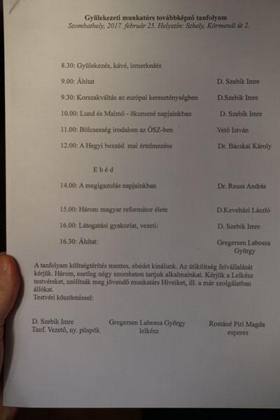 Az első alkalmon az európai kereszténységről és az ökumenéről tartott előadást Szebik Imre, majd Vető István az Ószövetség irodalmi vonatkozásairól beszélt. A tanfolyamon nemcsak az elméleti, hanem gyakorlati képzést is elsajátíthatják a gyülekezetek tagjai. Így elsőként a látogatásról esett szó.