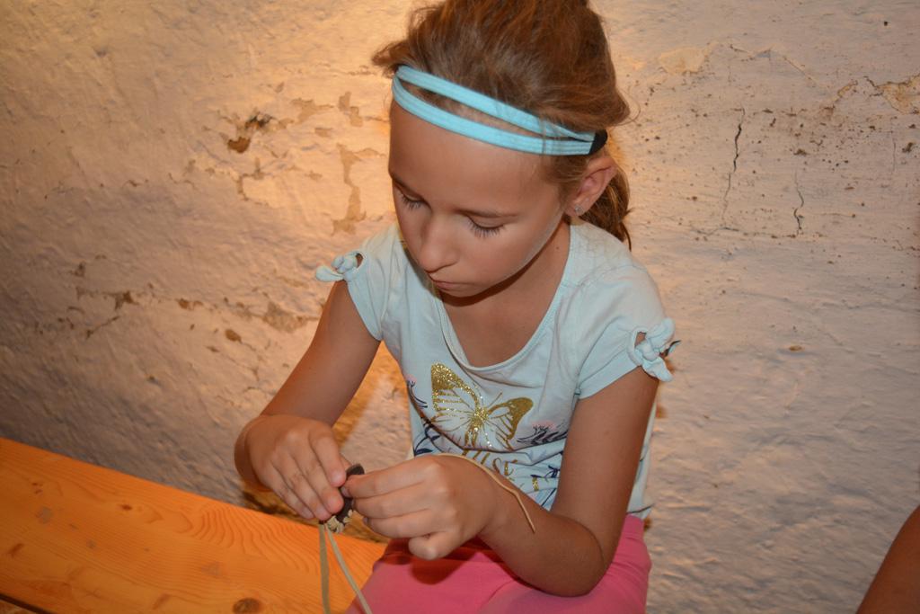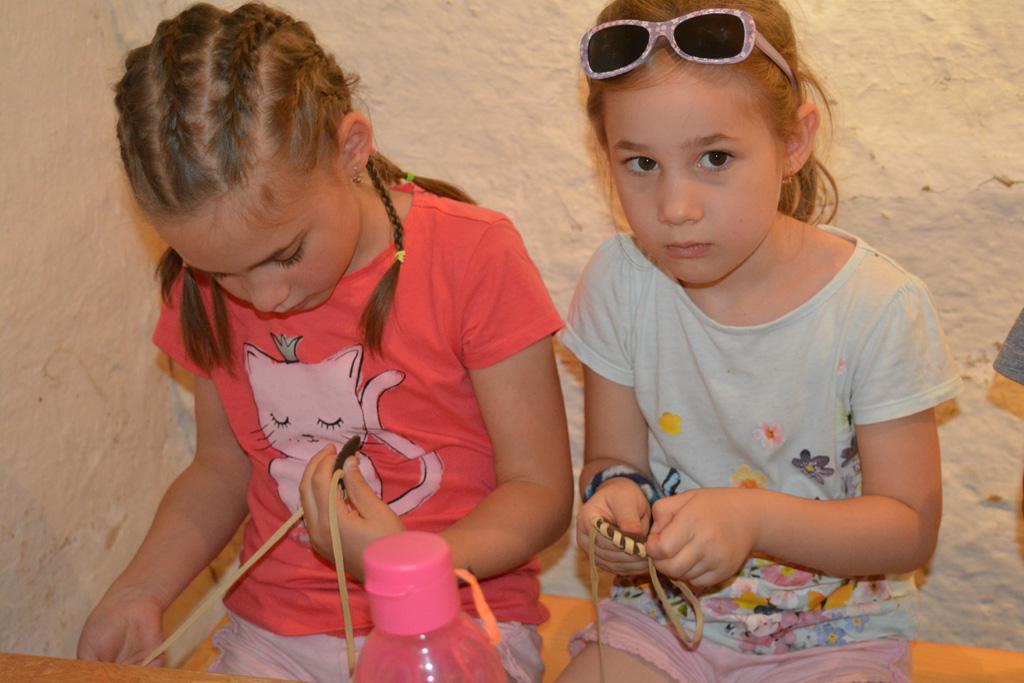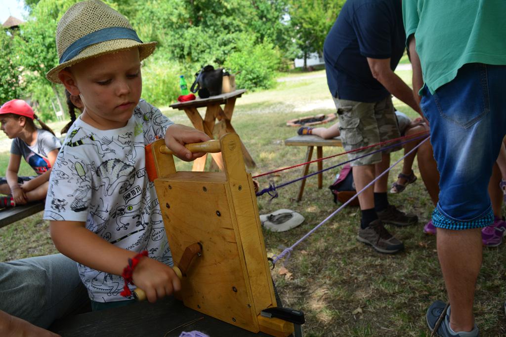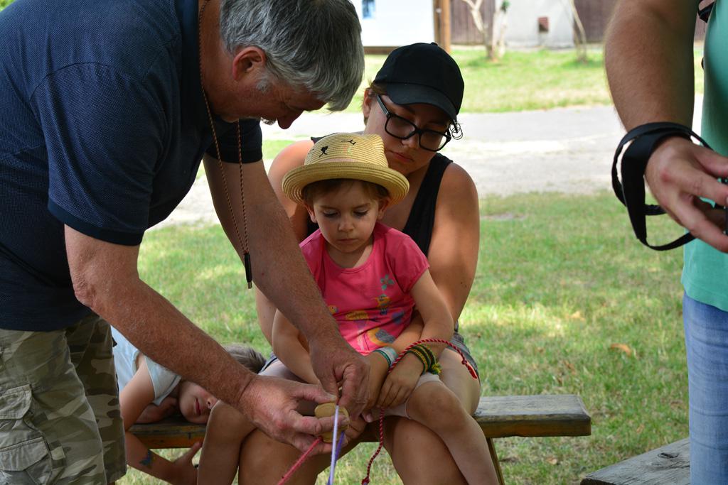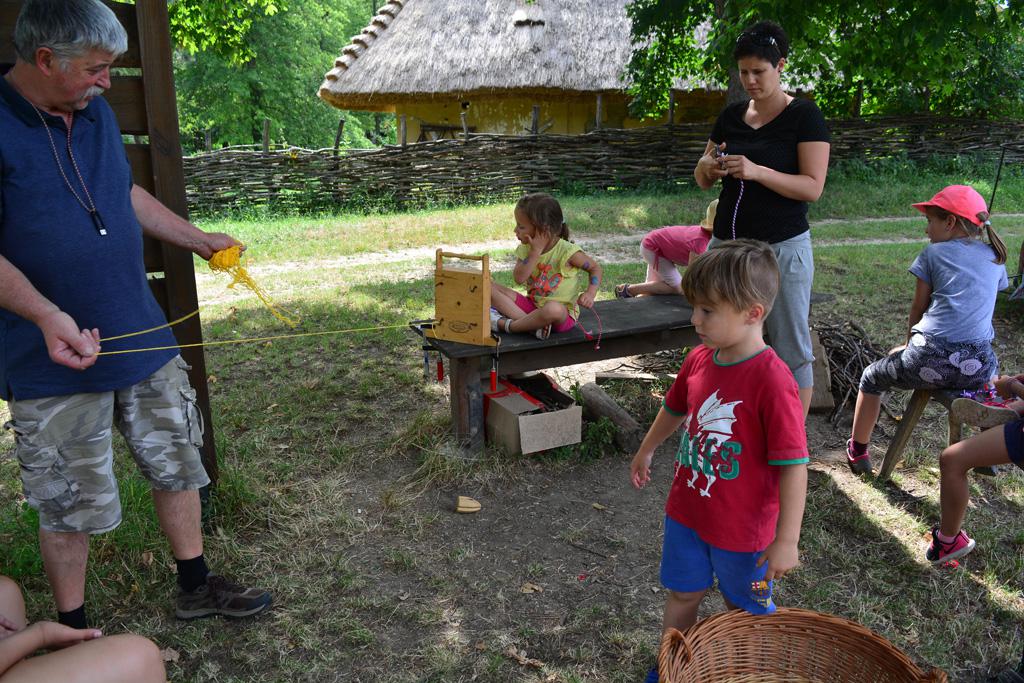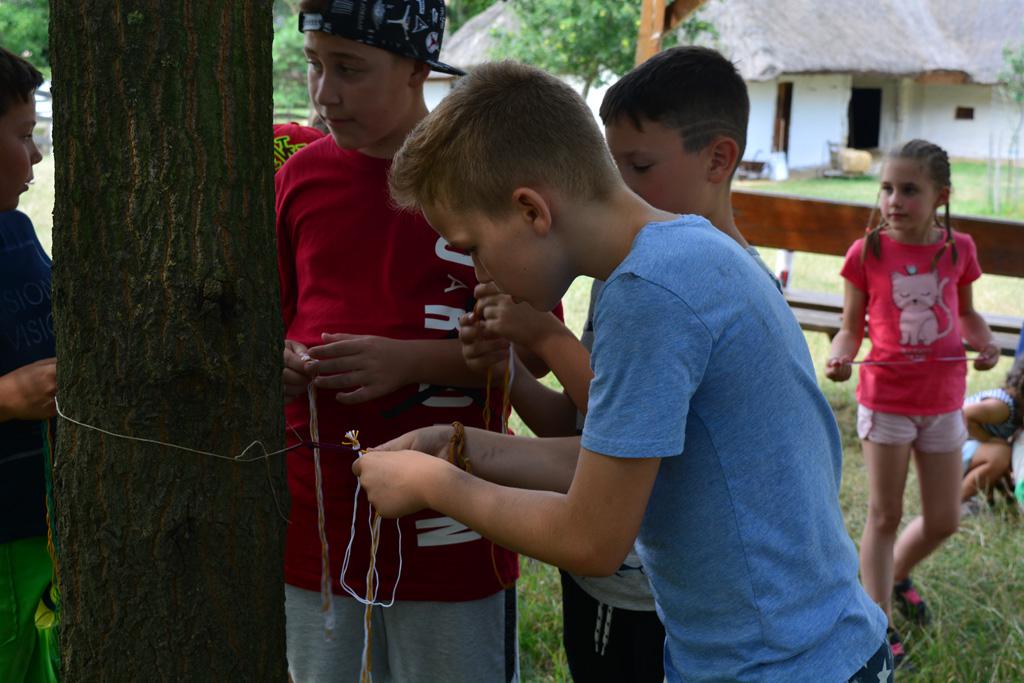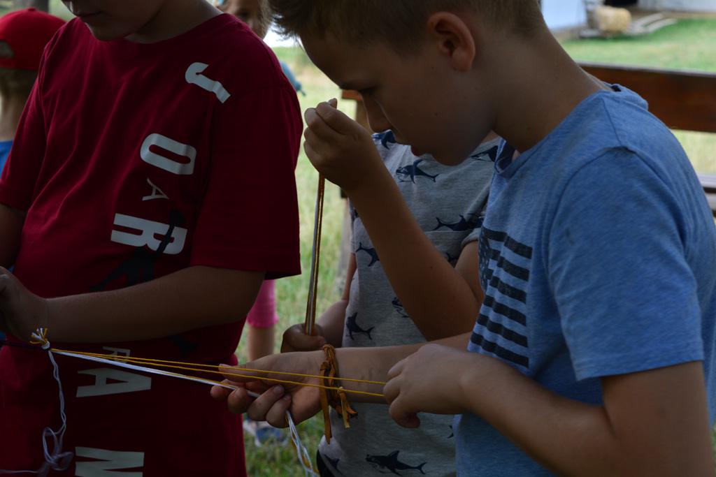 Szerdán a napindító áhítatot már a Múzeumfaluban tartottuk, miután a Skanzen Felsőszölnöki házában kialakítottuk a napi bázisunkat. A táborozók délelőtt a különböző házakkal, régi bútorokkal és eszközökkel ismerkedhettek, és könyvjelzőt is készíthettek. Az ebédünk is helyben készült: gulyásleves és langalló volt a napi menü. Délután kötélverés, körmönfonás és madárles volt a programok között. Természetesen ezen a napon sem maradhattak el a labdajátékok sem, sőt, a hely adottságait kihasználva, még egy békés végkimenetelű harcra is sor kerülhetett. Igazán szép napot töltöttünk a Skanzenben, ahol szebbnél szebb karkötők és könyvjelzők is készültek.