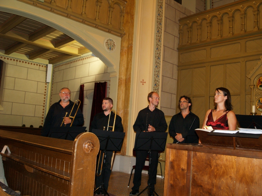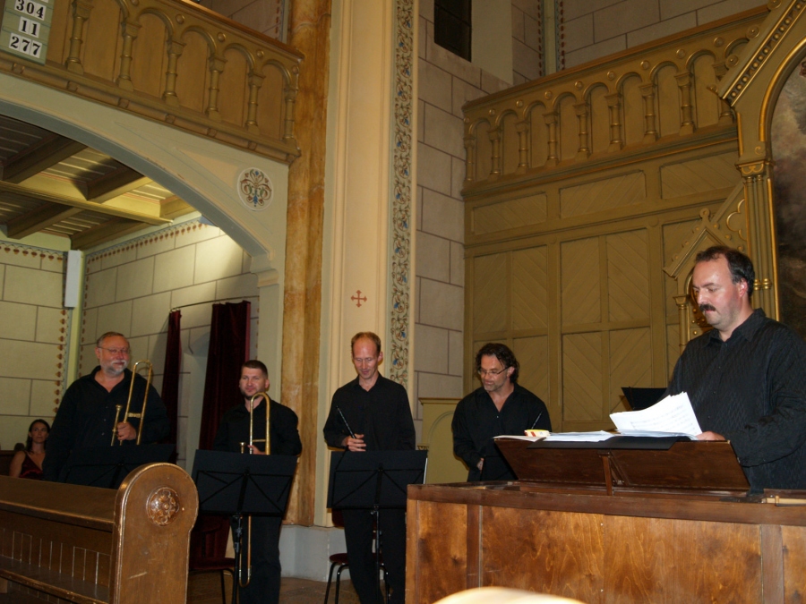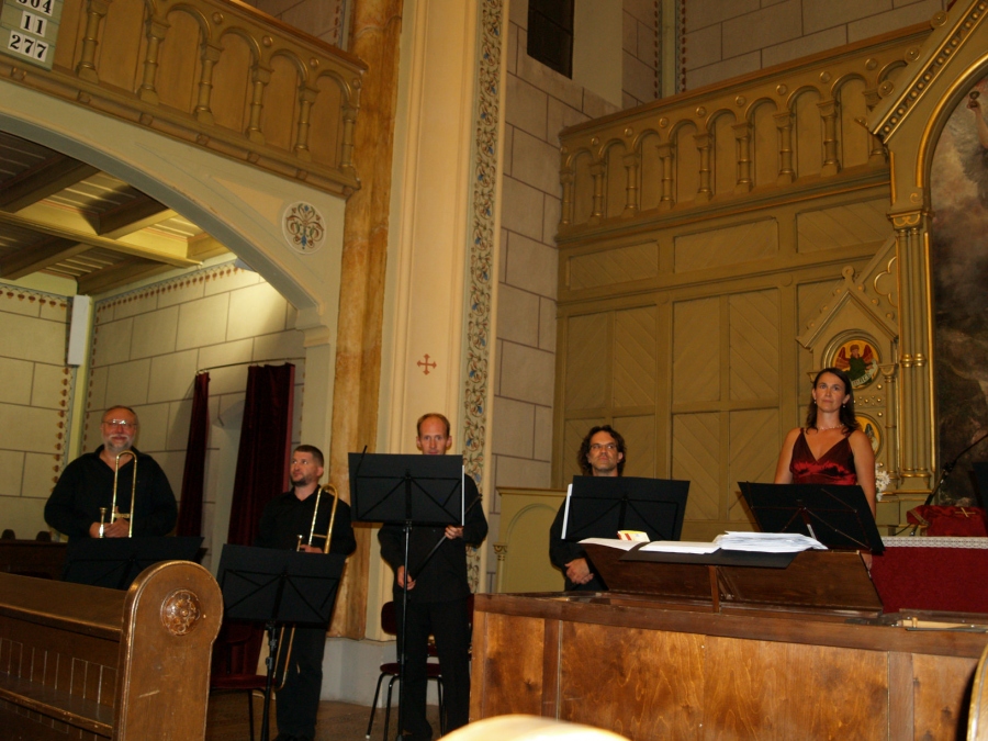 A 450 éve született Giovanni Gabrieli és kortársainak műveiből hallhattunk ízelítőt a karnevál idején az evangélikus templomban. Velencéből terjed el szerte Európában az a többkórusos technika, mely kihasználva a templom adottságait, a hangszeregyütteseket a tér más-más pontjain helyezi el. A művészek zinken, trombitákon, harsonákon, orgonán mutattak be reneszánsz és barokk muzsikákat.