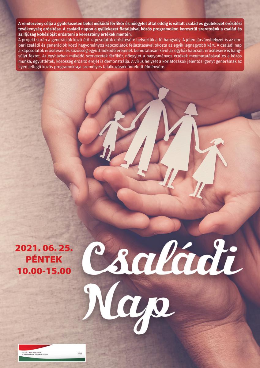 A rendezvény célja volt a gyülekezeten belül működő férfikör és nőegylet által eddig is vállalt család és gyülekezet erősítési tevékenység erősítése. A családi napon a gyülekezet fiataljaival közös programokon keresztül szeretnénk a család és az ifjúság kohézióját erősíteni a keresztény értékek mentén.