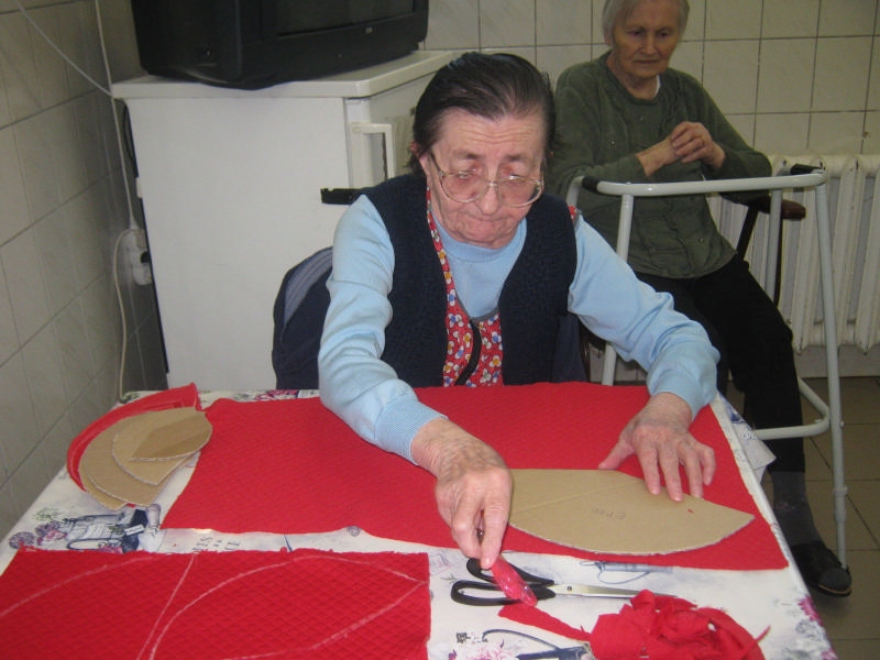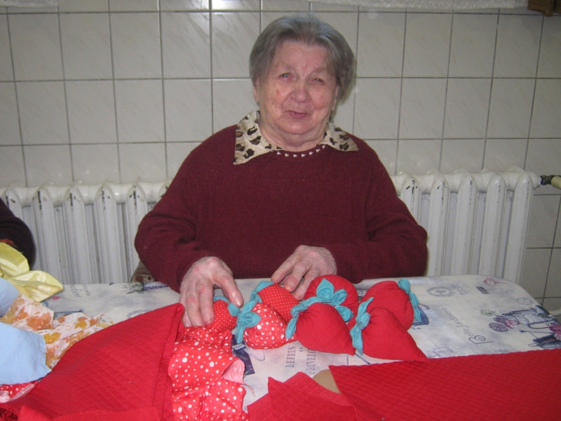 Margit néni nagyon pontosan dolgozott, mindig mosolygott munka közben.Gizi néni a leveleket rajzolta meg Juliska néni tömőanyagokat gyártott. (rengeteget)Ilonka néni a szobában is folytatta a munkát, a levelek összevarrásával.Gyuri bácsi, Éva néni az összevarrásnál segítettek
