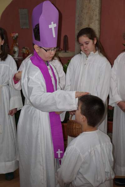 „Szent Balázs püspök és vértanú esedezése által mentsen és őrizzen meg téged az Úr a torokbaj és minden egyéb bajoktól az Atyának, Fiúnak és Szentlélek Istennek nevében. Ámen.”