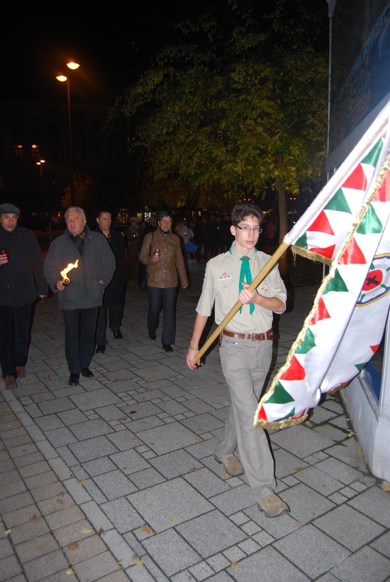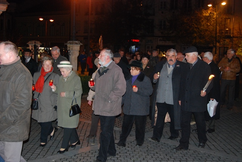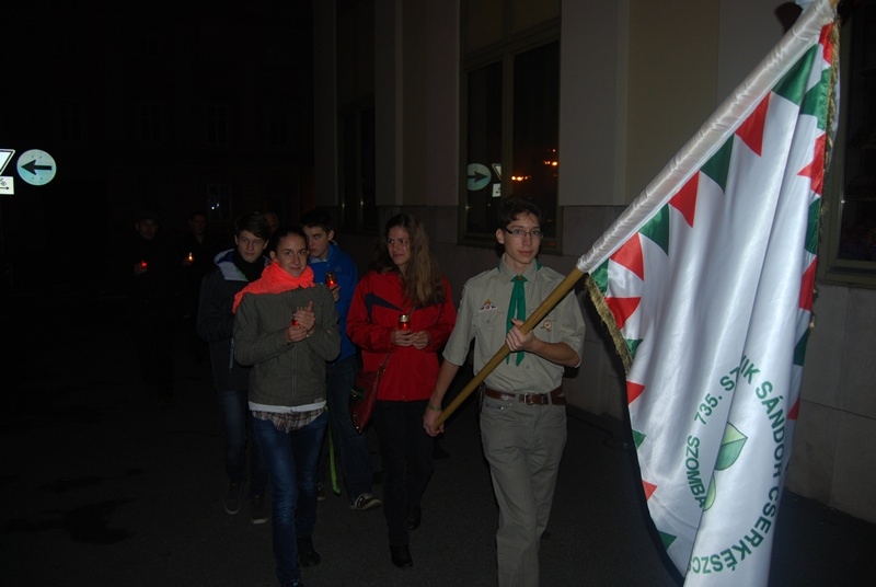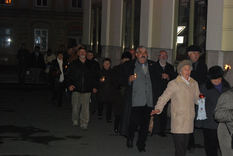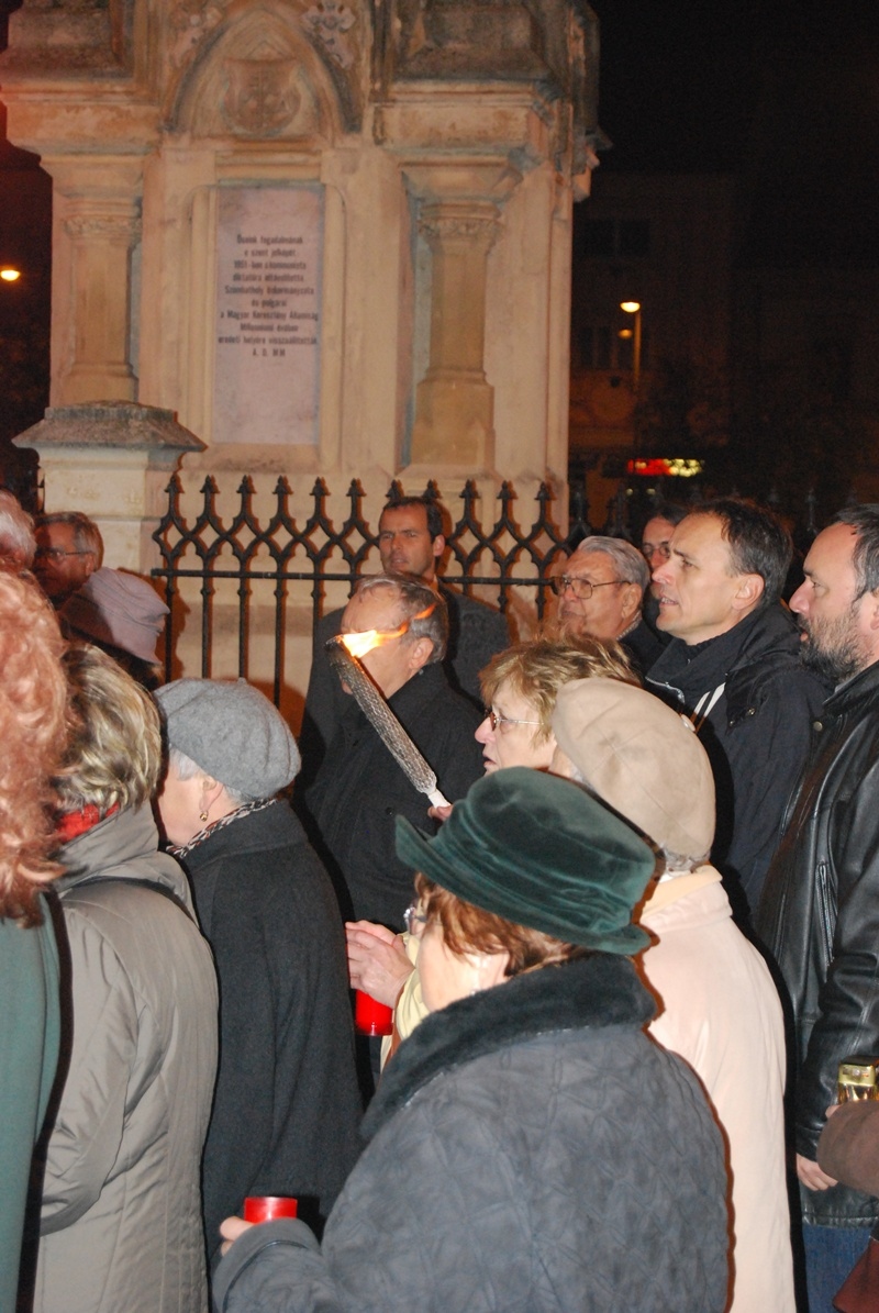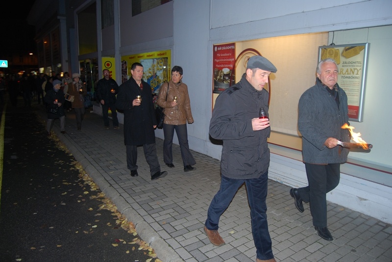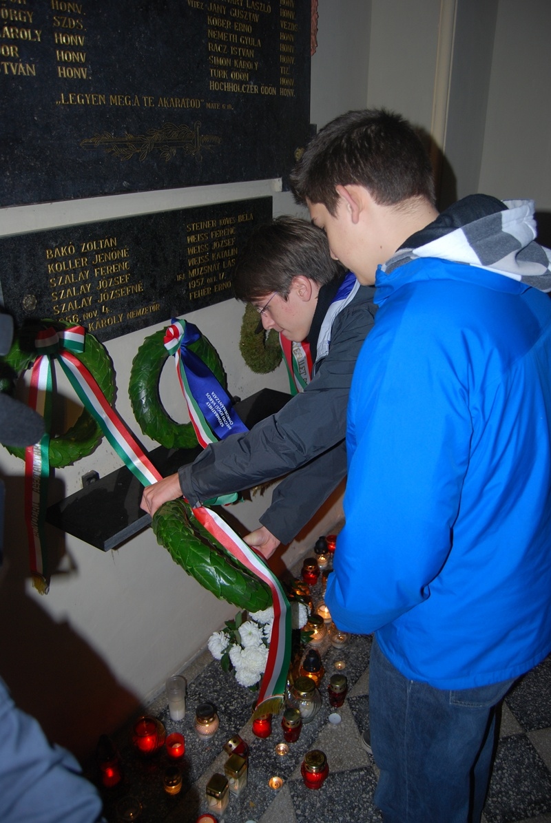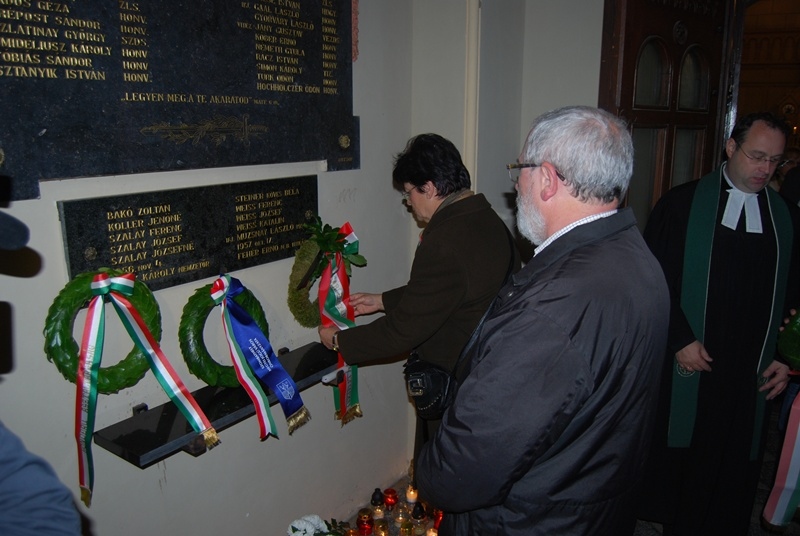 18 órakor gyülekeztünk a Fő téren. Az emlékezőkkel közösen a Szentháromság-szobortól fáklyákkal és mécsesekkel vonultunk végig Szombathelyen a megemlékezés helyszínére az evangélikus templomba. A menetet a 735. sz. Reményik Sándor Cserkészcsapat kísérte. A templomban egy rövid áhitat keretében emlékeztünk '56 hőseire, valamint az előadók, köztük Petró János elevenítette fel a forradalom eseményeit. Az áhitat végén az '56-os emléktáblánál helyezték el az emlékezők, köztük a szervezők a Honderű Asztaltársaság tagjai is az emlékezés koszorúit.