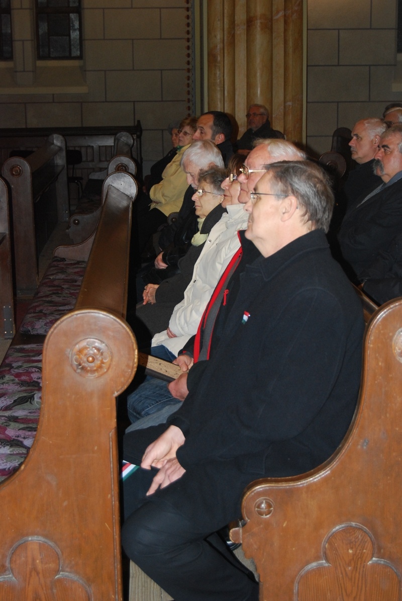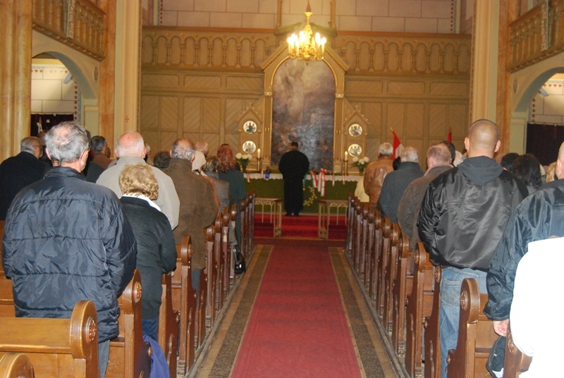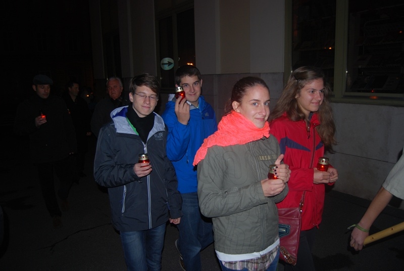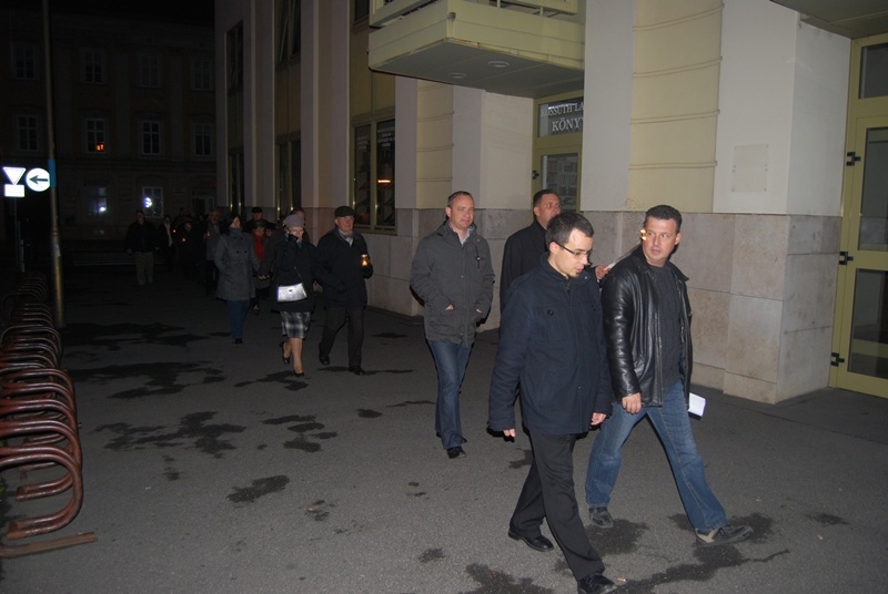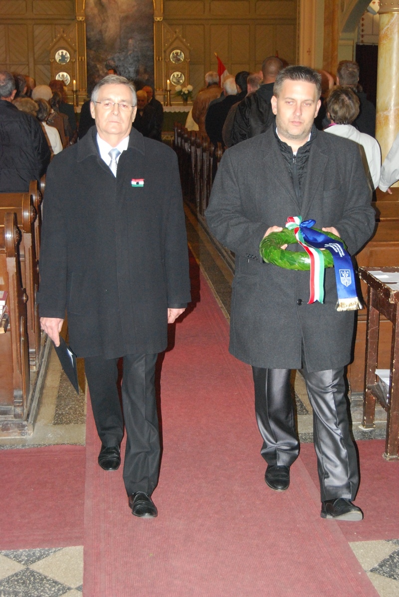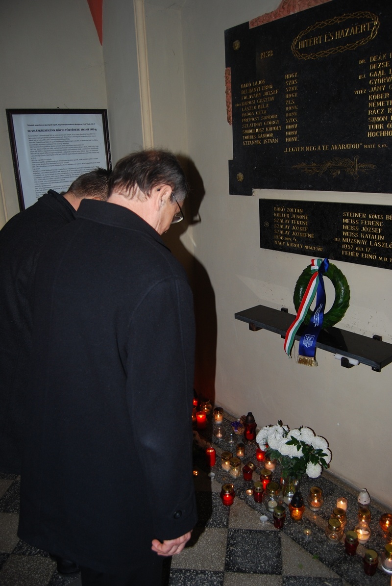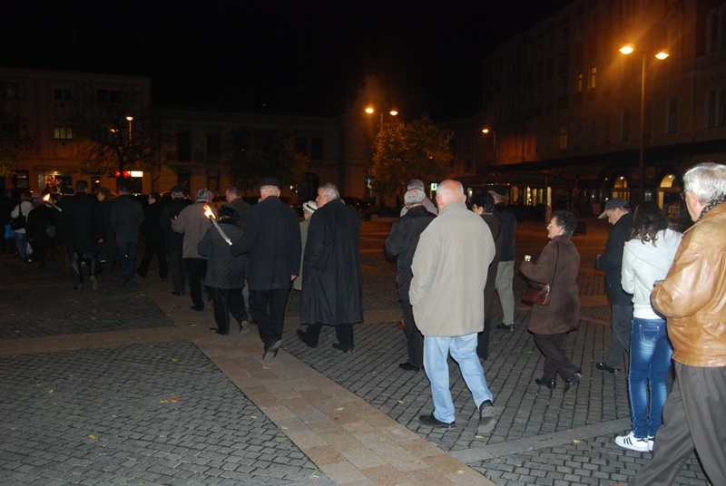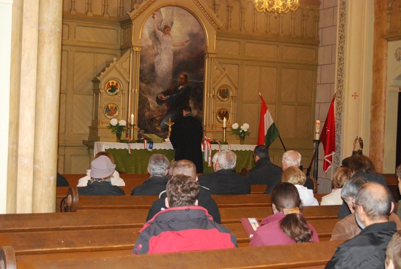 18 órakor gyülekeztünk a Fő téren. Az emlékezőkkel közösen a Szentháromság-szobortól fáklyákkal és mécsesekkel vonultunk végig Szombathelyen a megemlékezés helyszínére az evangélikus templomba. A menetet a 735. sz. Reményik Sándor Cserkészcsapat kísérte. A templomban egy rövid áhitat keretében emlékeztünk '56 hőseire, valamint az előadók, köztük Petró János elevenítette fel a forradalom eseményeit. Az áhitat végén az '56-os emléktáblánál helyezték el az emlékezők, köztük a szervezők a Honderű Asztaltársaság tagjai is az emlékezés koszorúit.