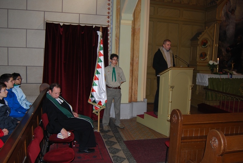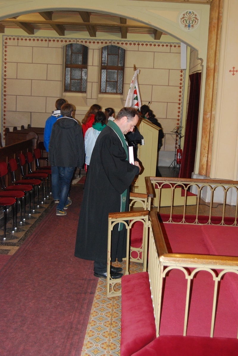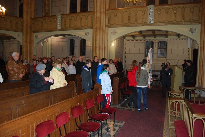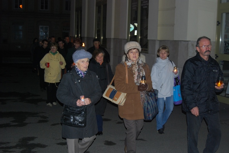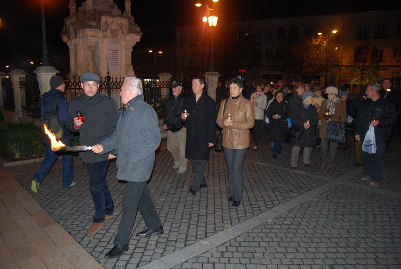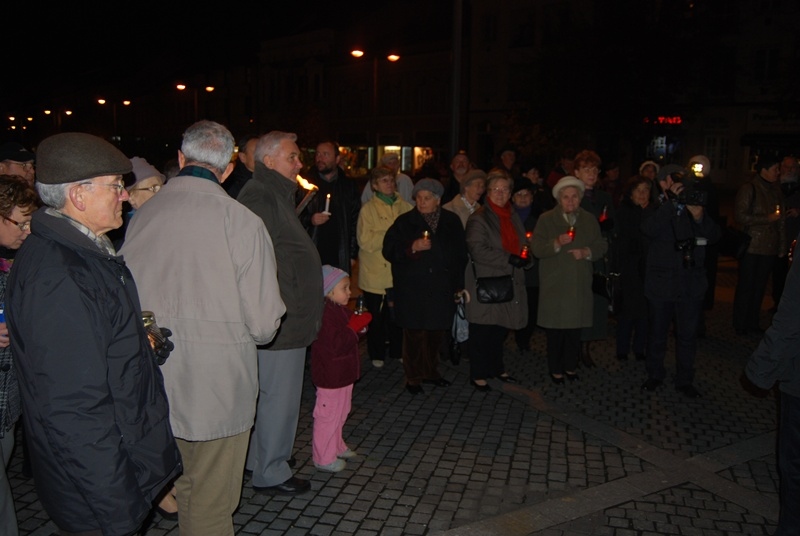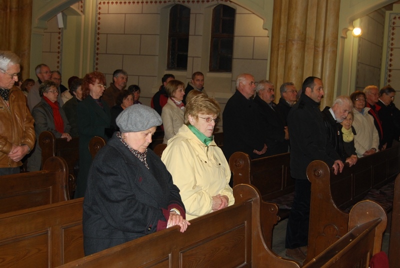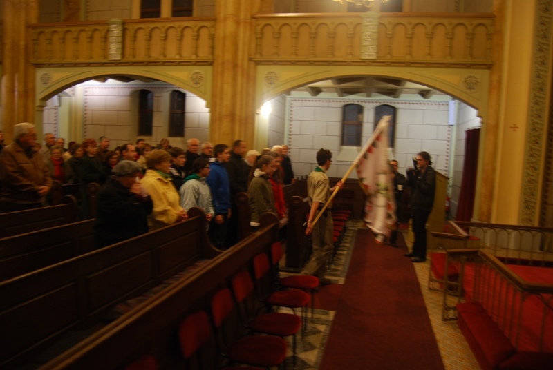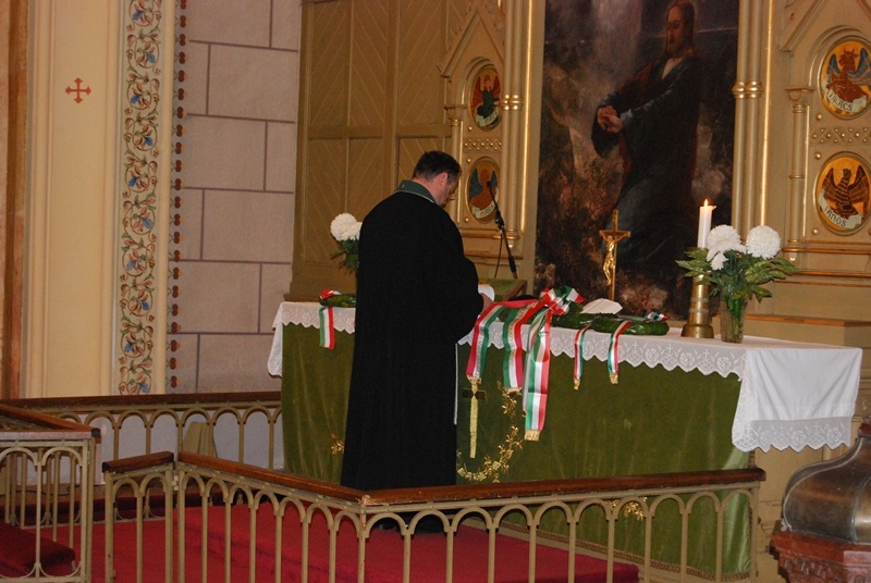 18 órakor gyülekeztünk a Fő téren. Az emlékezőkkel közösen a Szentháromság-szobortól fáklyákkal és mécsesekkel vonultunk végig Szombathelyen a megemlékezés helyszínére az evangélikus templomba. A menetet a 735. sz. Reményik Sándor Cserkészcsapat kísérte. A templomban egy rövid áhitat keretében emlékeztünk '56 hőseire, valamint az előadók, köztük Petró János elevenítette fel a forradalom eseményeit. Az áhitat végén az '56-os emléktáblánál helyezték el az emlékezők, köztük a szervezők a Honderű Asztaltársaság tagjai is az emlékezés koszorúit.