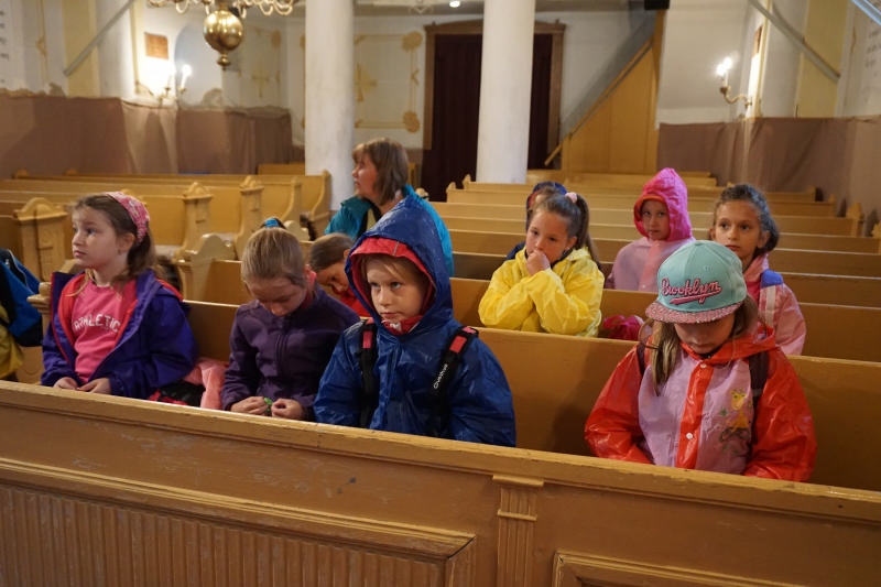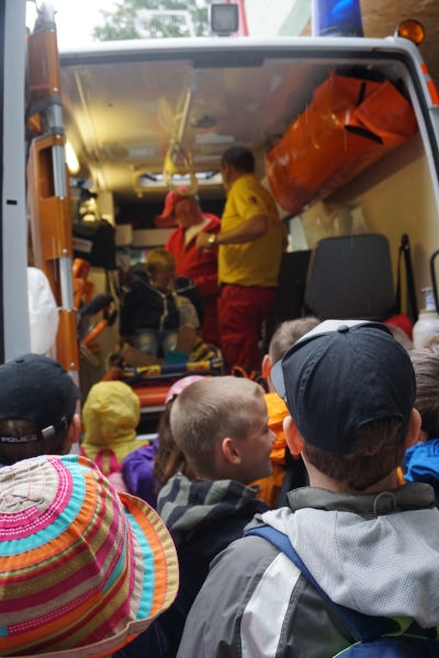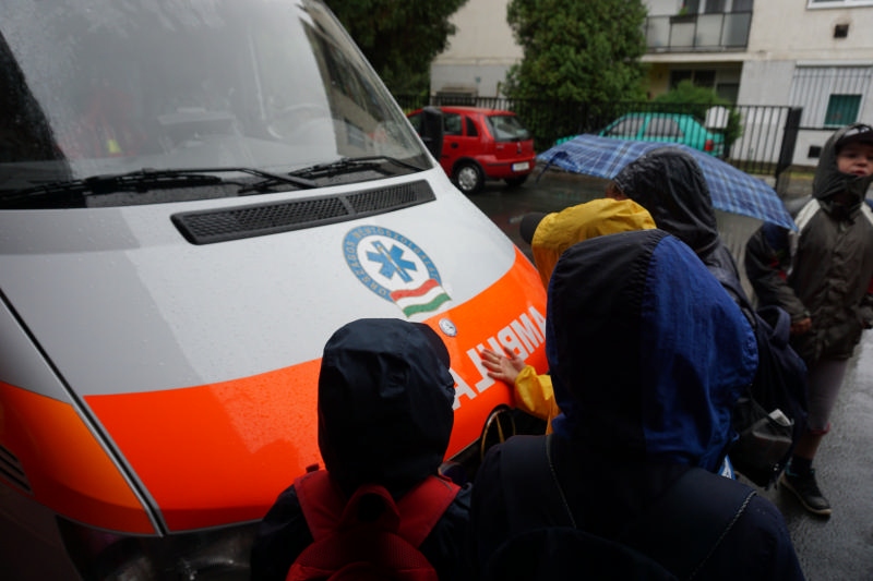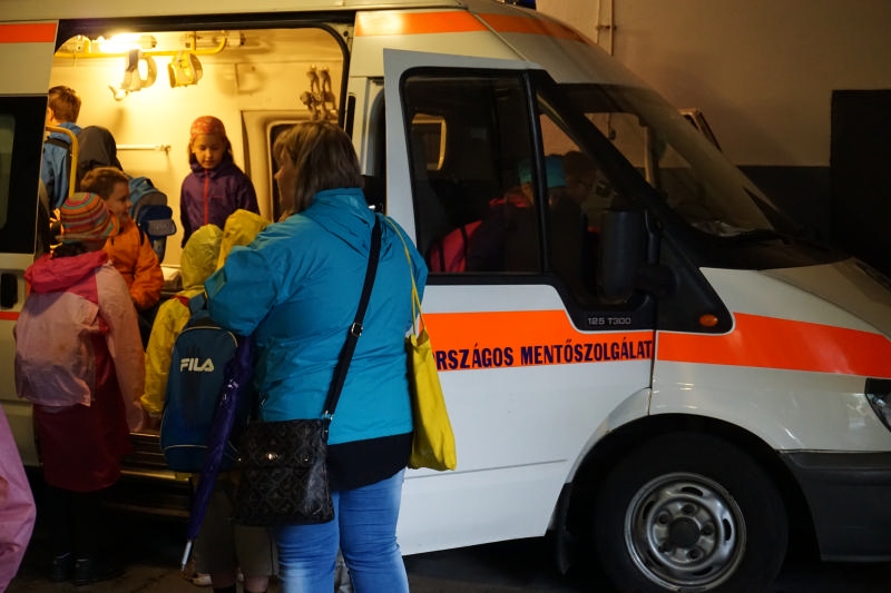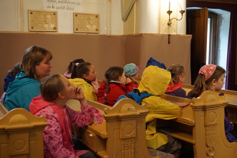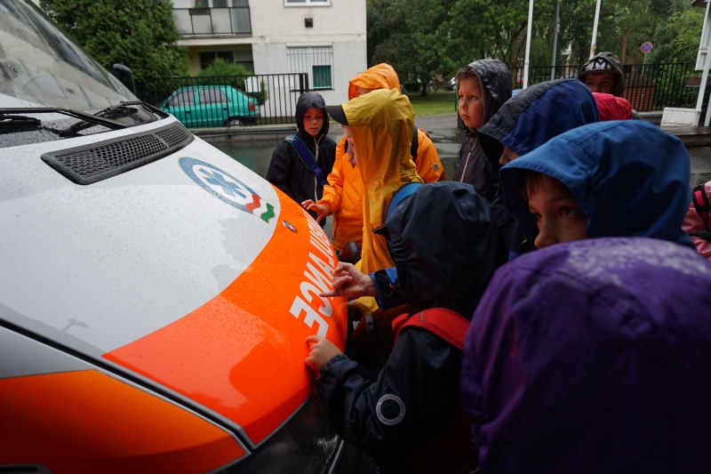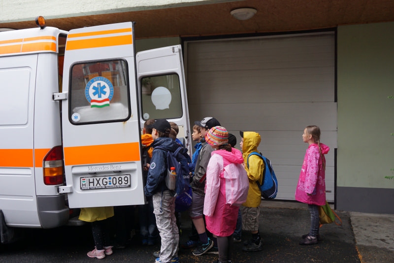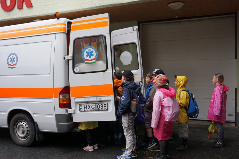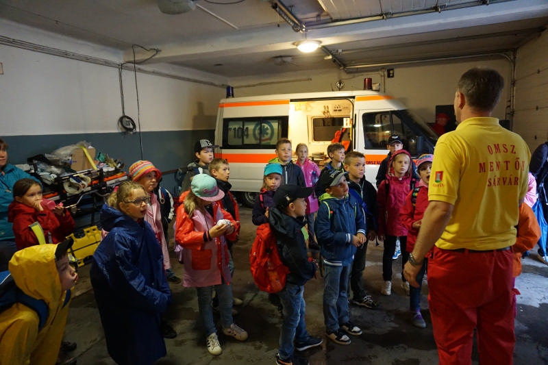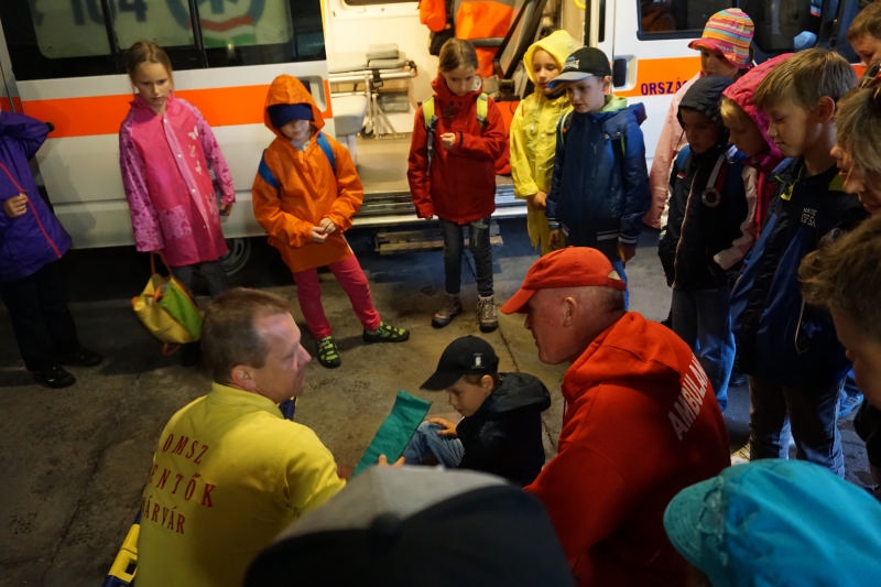 Esős napra ébredtünk, így nagy hőstettet hajtottunk végre, mikor elindultunk Sárvárra kirándulni - ezúttal vonattal. Elsőként a mentőállomást néztük meg. Ott nagyon látványos bemutatóval fogadtak bennünket. Patrik, alias Boldizsár hadirokkantként került a mentőkocsiba, de természetesen mindenki kipróbálhatta, milyen a mentőben ülni sofőrként, vagy betegként. Ezután meglátogattuk az evangélikus templomot. Ázott verébseregként érkeztünk meg, így elsőként megszárítkoztunk az egyházközség gyülekezeti termében, ahol lelkész úr érdekes előadását hallgathattuk meg. Ezt követően az evangélikus templom történetét is megismerhettük. Túránk során még benéztük a várudvarba, majd a vasútállomás felé vettük az irányt. Kicsit korábban mint terveztük, de a szülők segítségével hamar visszaértünk az iskolába, ahol még játszhattak a táborozók.
