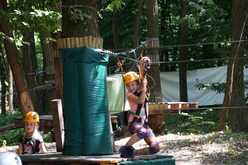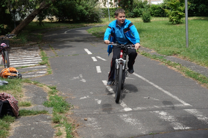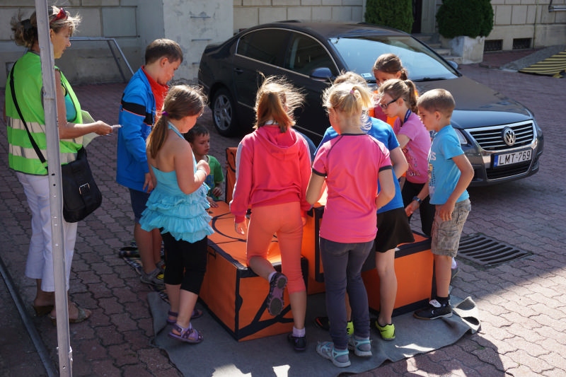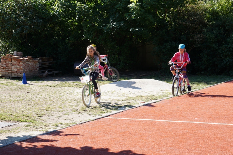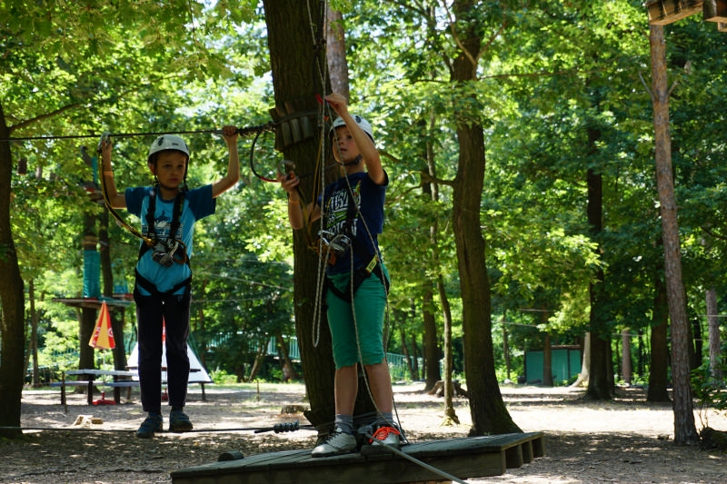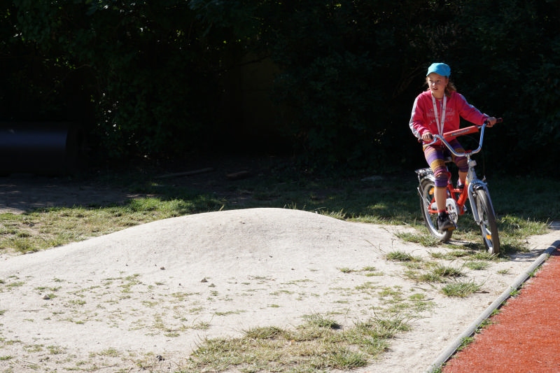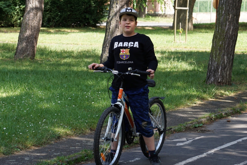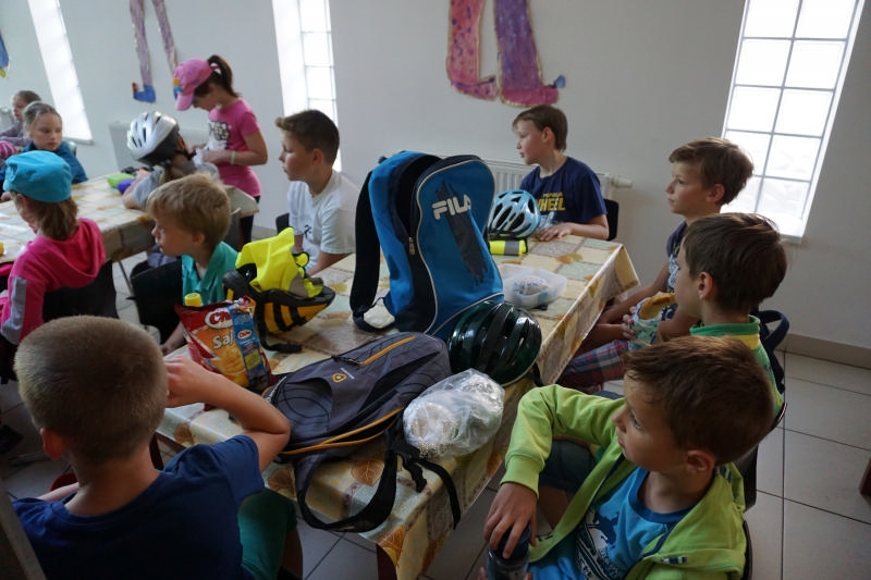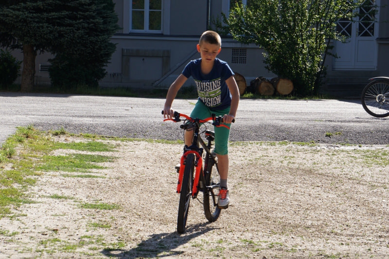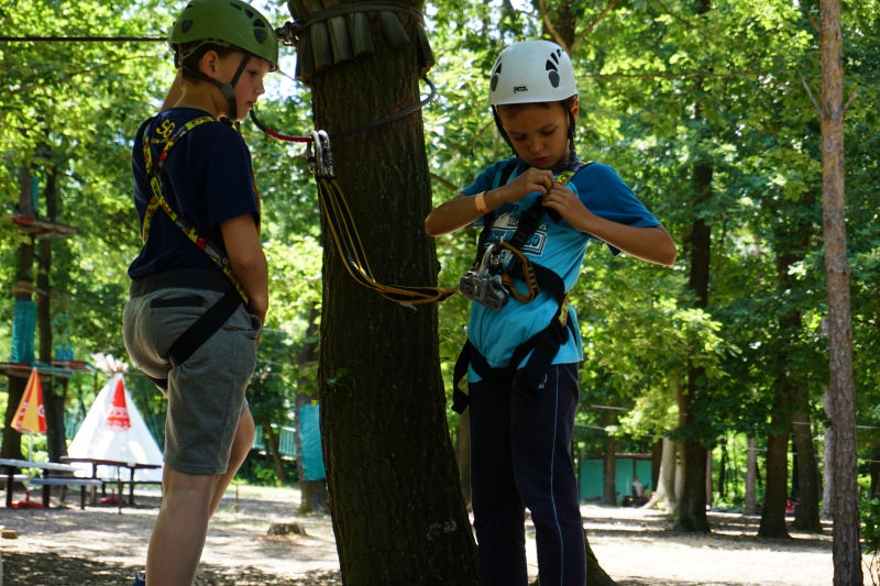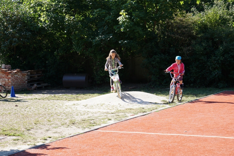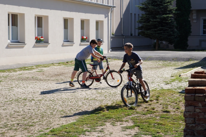 A tábor első napján ismerkedtünk egymással, a KRESZ szabályokkal, majd kerékpárra pattantunk és bejártuk a környéket. Nem volt zökkenőmentes az első túra: a bicikliknek hála felfedezhettük, hogy kitűnő kerékpárjavító-mester van a csapatunkban. Sorban potyogtak le a láncok, melyeket Heitler Dávid szerelőmester helyezett vissza szakszerűen a biciklikre. Délután még a Kalandvárosban vártak ránk nagy kalandok, ki várkapitányként, ki hegymászóként állta meg a helyét.