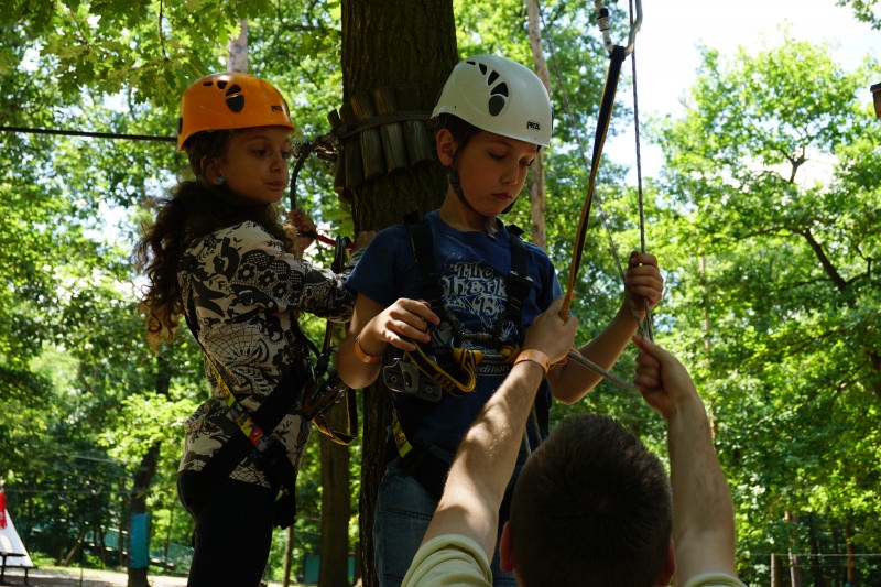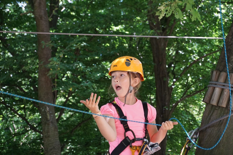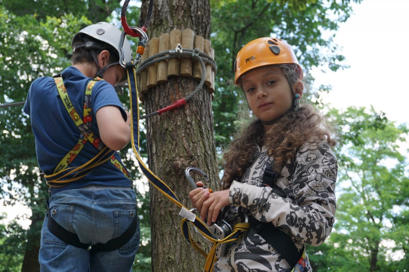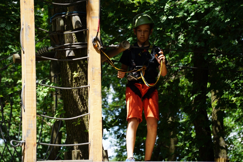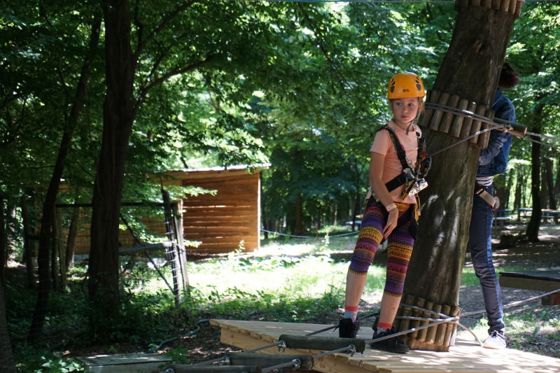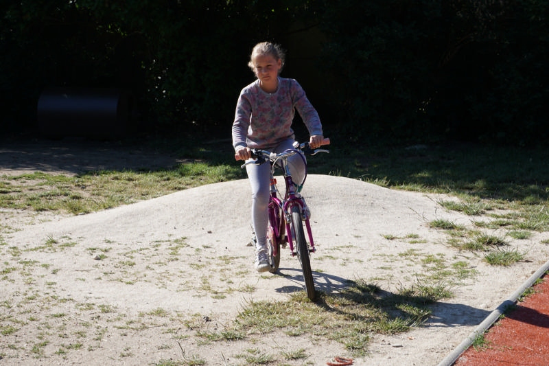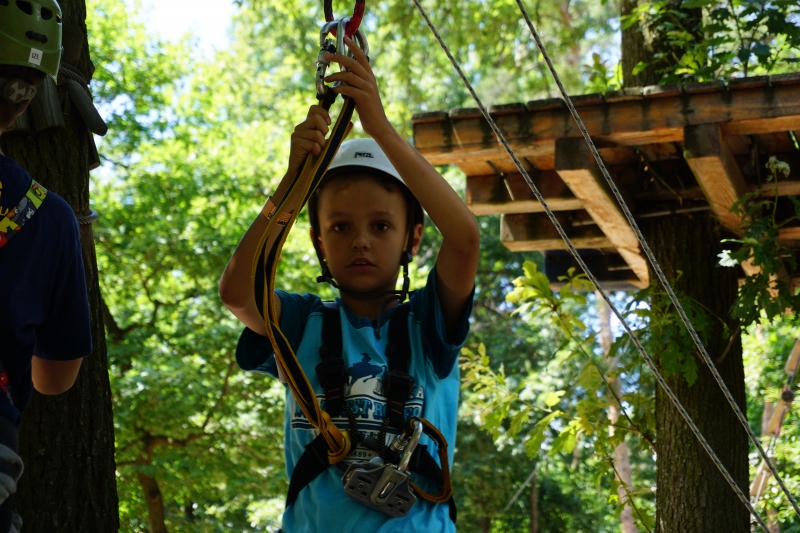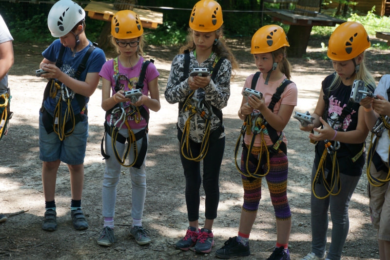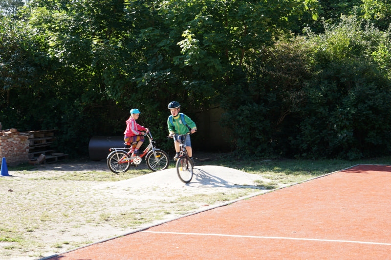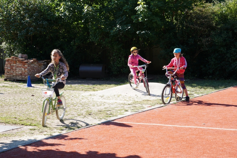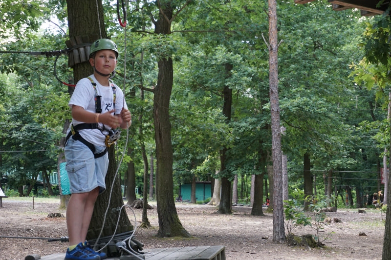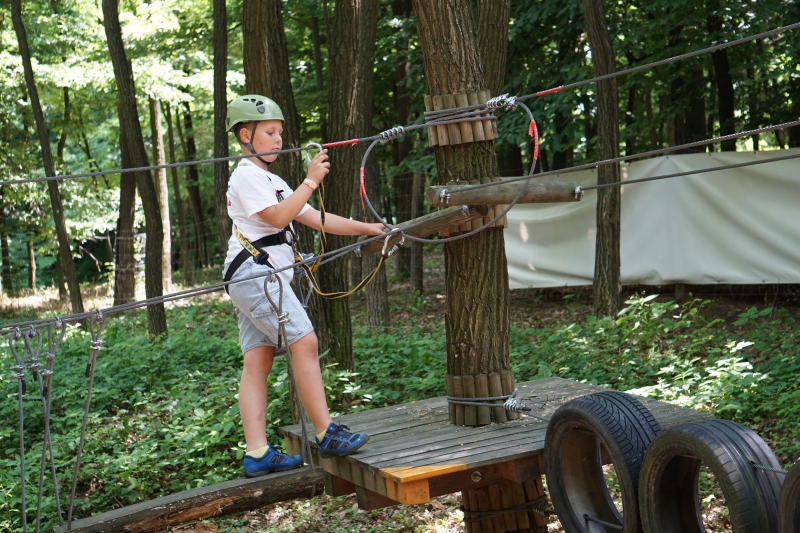A tábor első napján ismerkedtünk egymással, a KRESZ szabályokkal, majd kerékpárra pattantunk és bejártuk a környéket. Nem volt zökkenőmentes az első túra: a bicikliknek hála felfedezhettük, hogy kitűnő kerékpárjavító-mester van a csapatunkban. Sorban potyogtak le a láncok, melyeket Heitler Dávid szerelőmester helyezett vissza szakszerűen a biciklikre. Délután még a Kalandvárosban vártak ránk nagy kalandok, ki várkapitányként, ki hegymászóként állta meg a helyét.