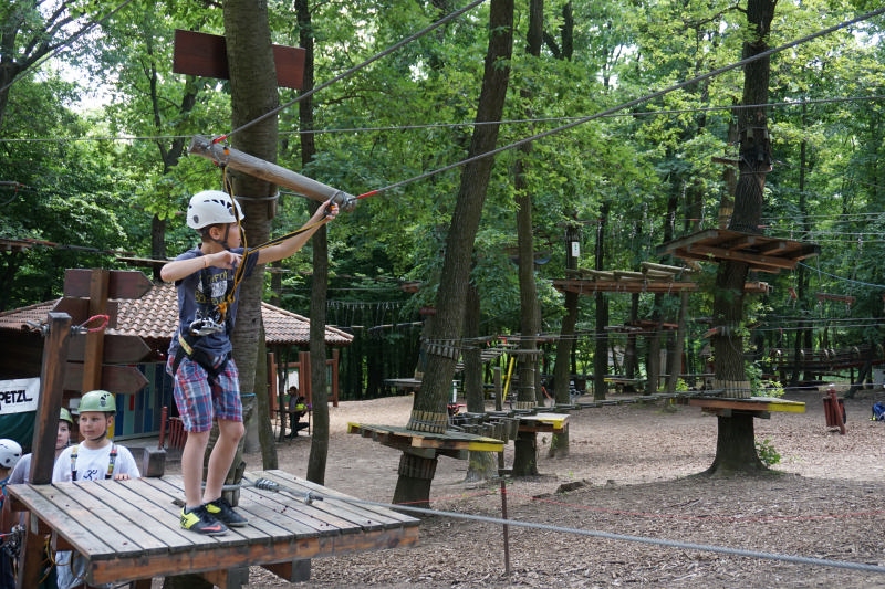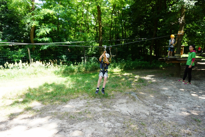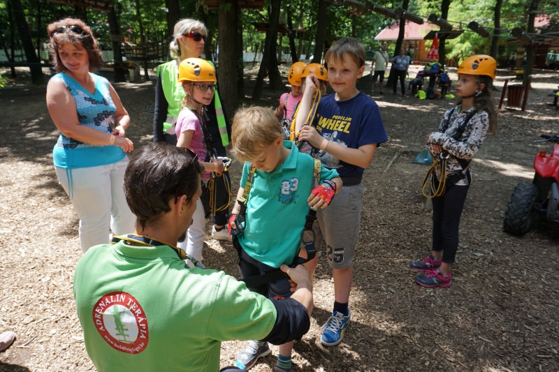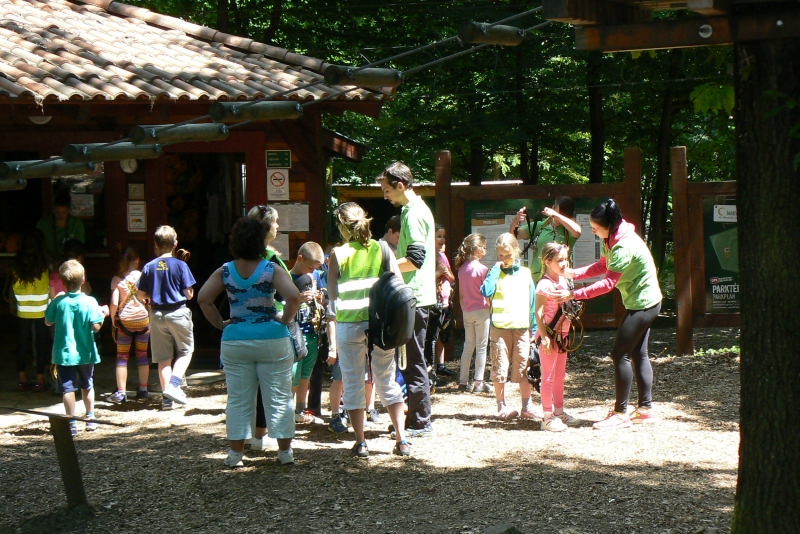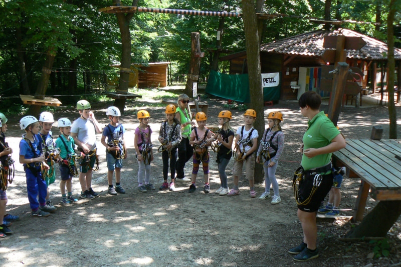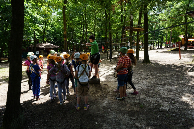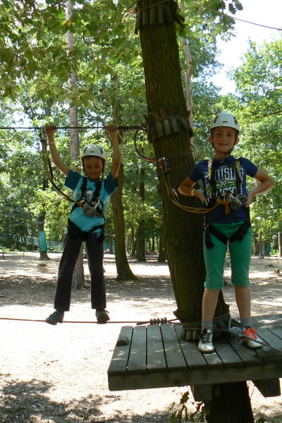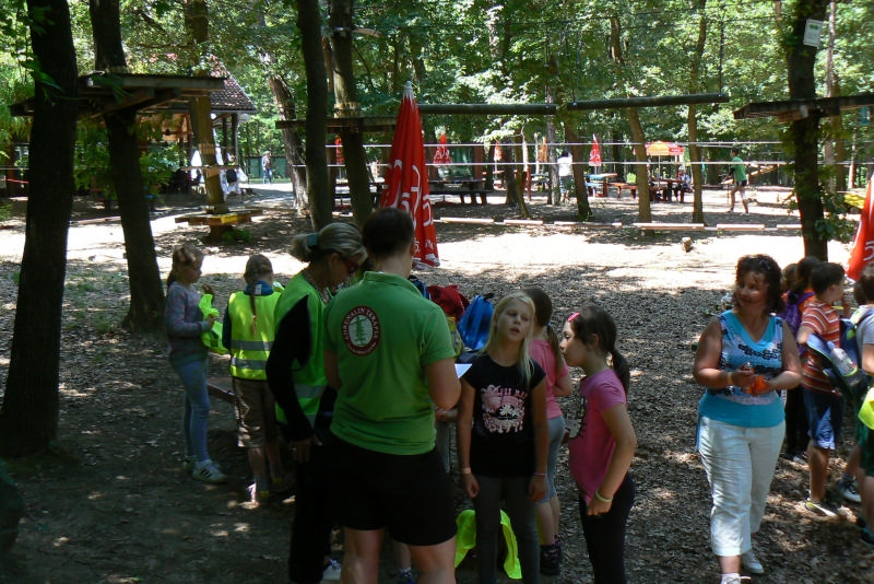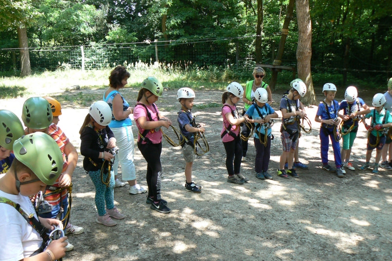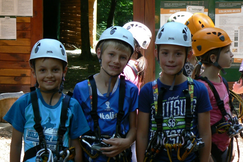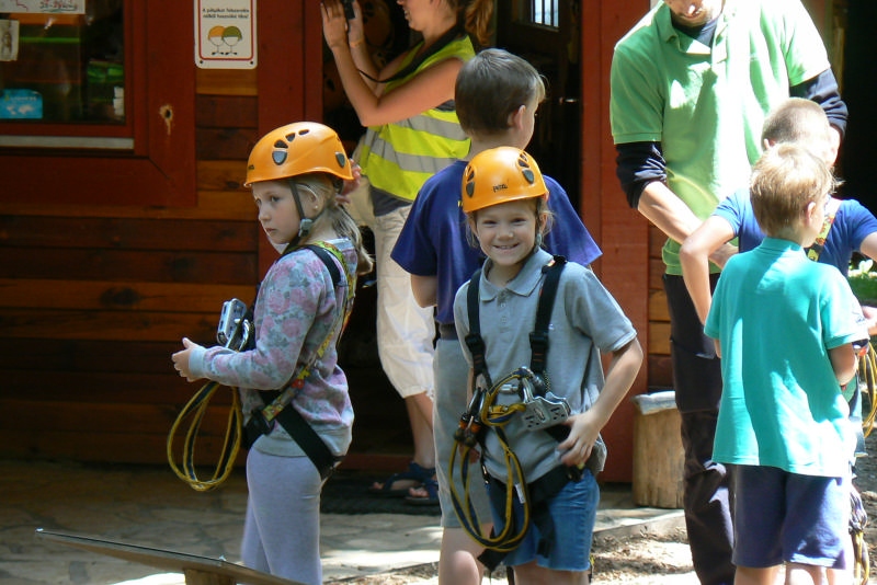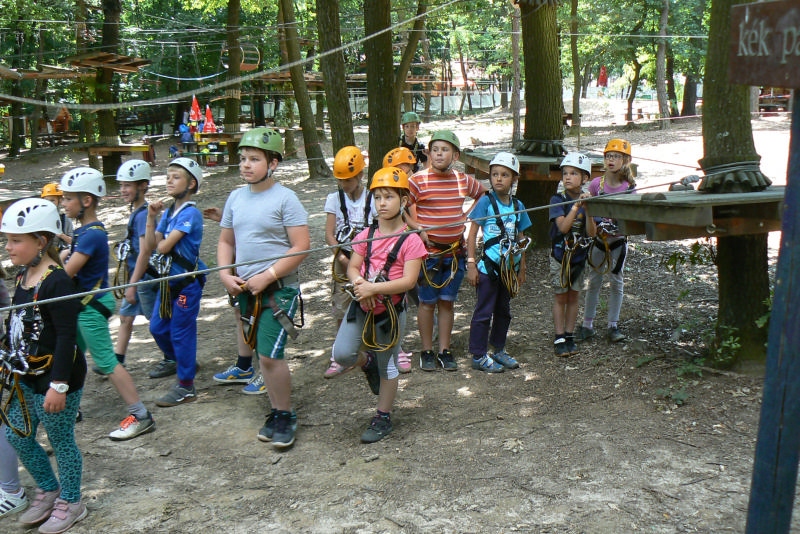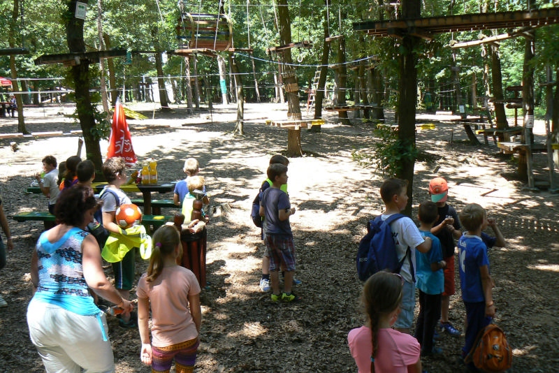 Hosszú túrára indult a kreszes csapat csütörtökön. A reggeli bemelegítő körök után a Holdfényliget felé vettük az irányt. Első körben azonban csak az utca végéig jutottunk, ott kis technikai hiba akadt, így vissza kellett fordulnunk. A suliban Béla bácsi gyorsan orvosolta a bűnös biciklik problémáit, hogy minél előbb útnak indulhassunk. A Gyöngyösfaluba vezető úton három szülő kísért minket, közülük ketten autóval, ha probléma adódna gyorsan cselekedhessünk. Erre azonban nem volt szükség, de azért nagy könnyebbség volt, hogy a csomagjaink a kocsikban utazhattak. A Holdfényligetbe érve a gyerekek izgatottan várták, hogy kipróbálhassák a kötélpályát. Rövid gyorstalpaló és egy pizza után már Maugliként csüngtek a köteleken. Hősiesen küzdötték végig magukat az akadályokon.