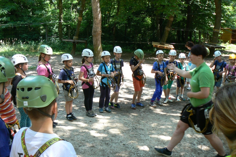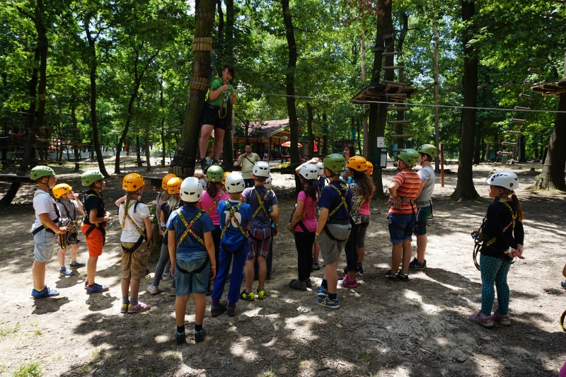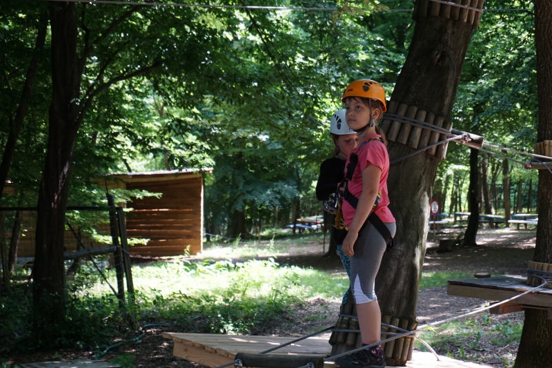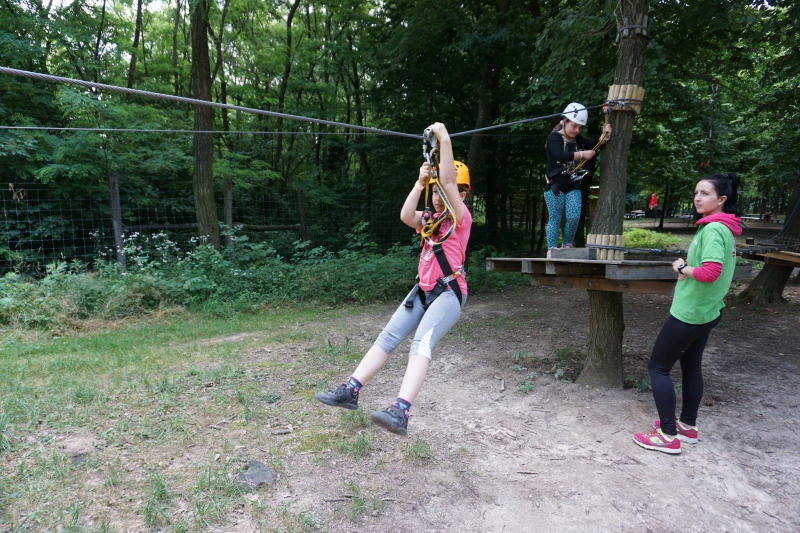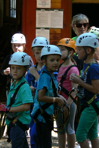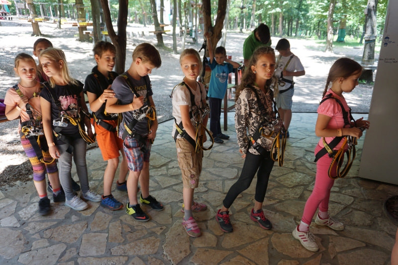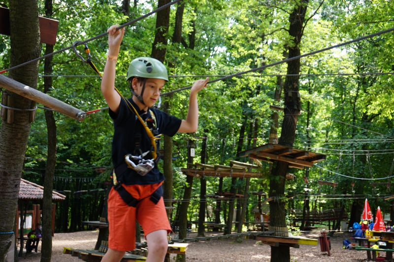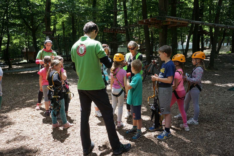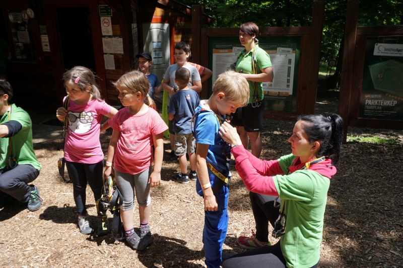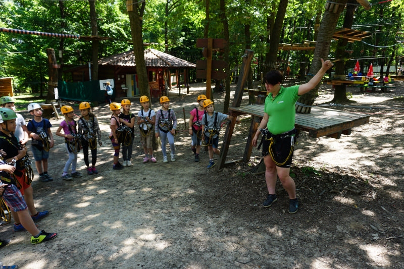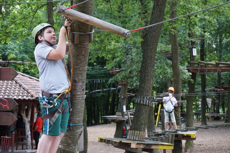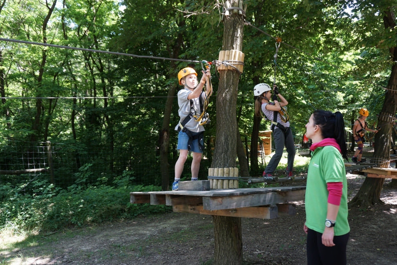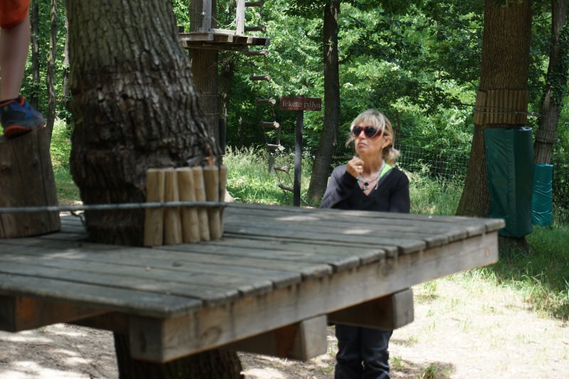 Hosszú túrára indult a kreszes csapat csütörtökön. A reggeli bemelegítő körök után a Holdfényliget felé vettük az irányt. Első körben azonban csak az utca végéig jutottunk, ott kis technikai hiba akadt, így vissza kellett fordulnunk. A suliban Béla bácsi gyorsan orvosolta a bűnös biciklik problémáit, hogy minél előbb útnak indulhassunk. A Gyöngyösfaluba vezető úton három szülő kísért minket, közülük ketten autóval, ha probléma adódna gyorsan cselekedhessünk. Erre azonban nem volt szükség, de azért nagy könnyebbség volt, hogy a csomagjaink a kocsikban utazhattak. A Holdfényligetbe érve a gyerekek izgatottan várták, hogy kipróbálhassák a kötélpályát. Rövid gyorstalpaló és egy pizza után már Maugliként csüngtek a köteleken. Hősiesen küzdötték végig magukat az akadályokon.